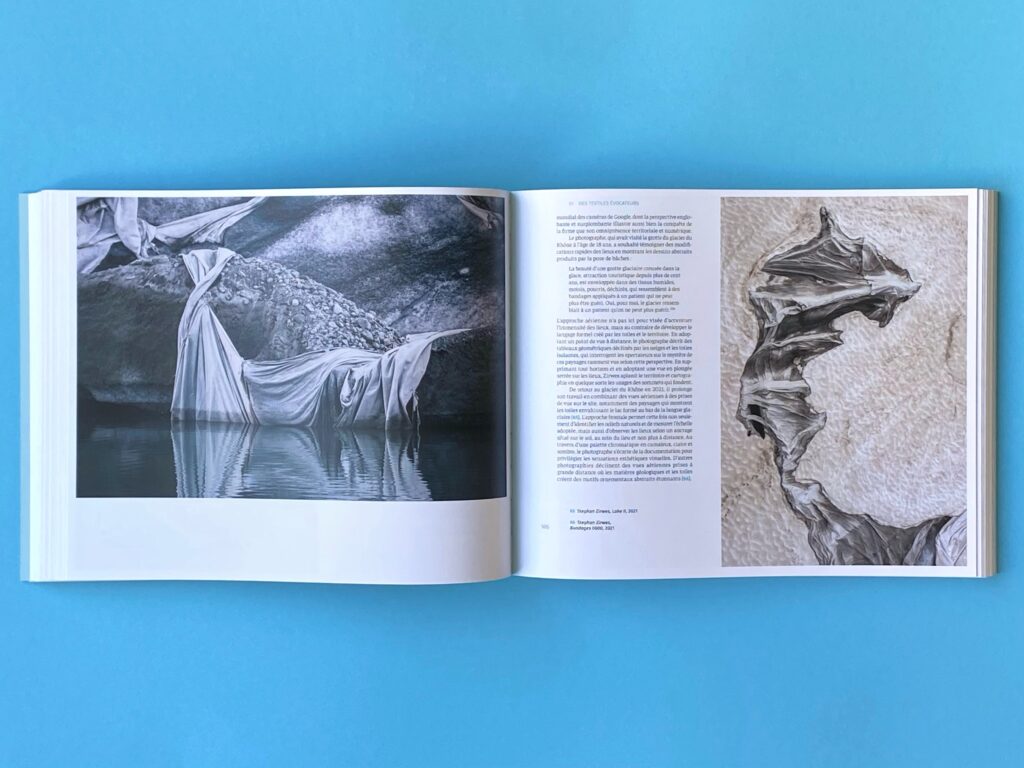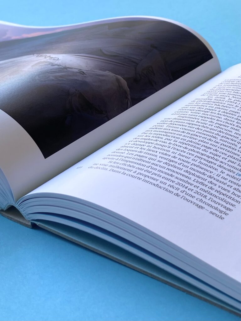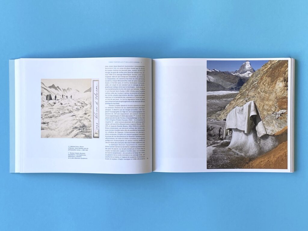 À la fois essai et beau livre, cet ouvrage propose une réflexion saisissante sur notre relation au vivant à travers l’analyse de photographies de glaciers alpins recouverts de bâches. Depuis le milieu des années 2000, en raison du réchauffement climatique, des toiles géothermiques sont posées pour ralentir la fonte de la glace durant l’été. Ces paysages hybrides et éphémères, entre intervention humaine et nature menacée, ont attiré l’attention de nombreux photographes et artistes, suisses comme internationaux.