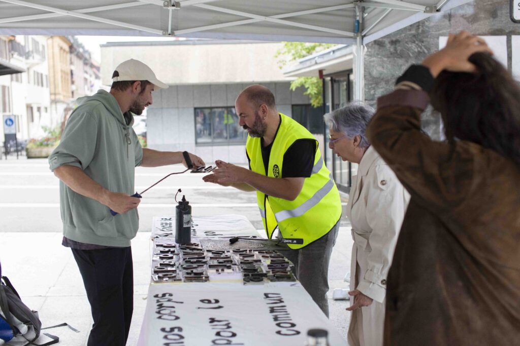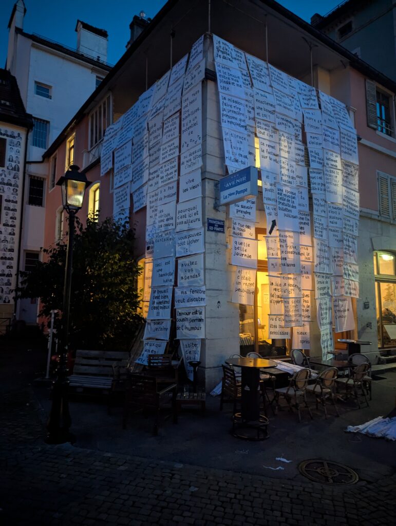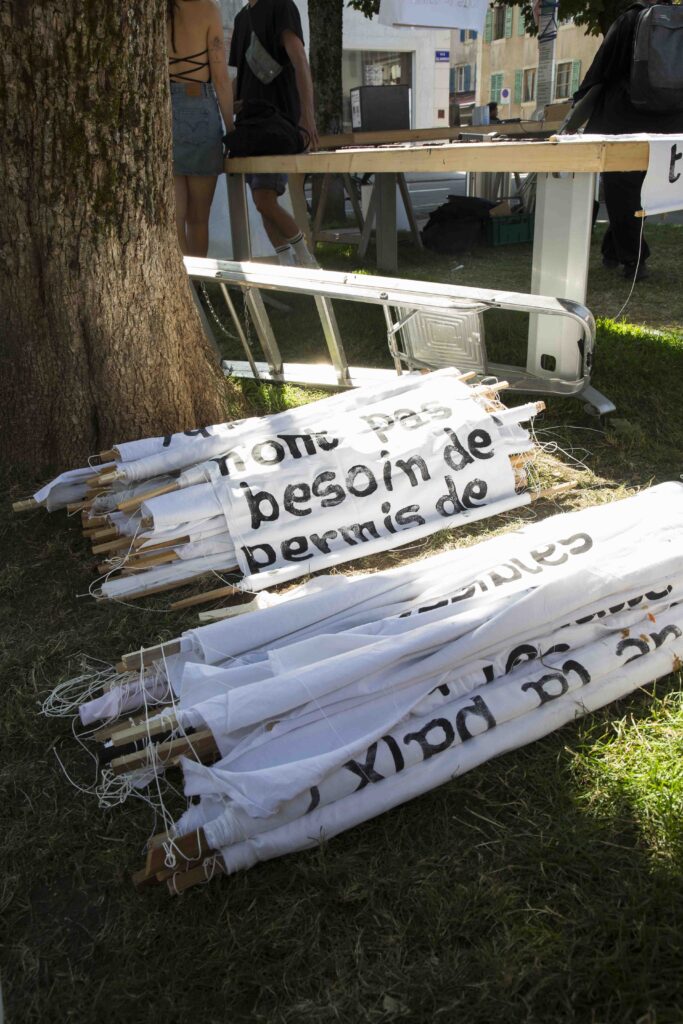 En 2025, l’action Les Banderoles a transformé la ville en une grande installation à ciel ouvert. Plus de 250 habitant·es ont imaginé et accroché des banderoles poétiques à leurs fenêtres, réenchantant les parcours du quotidien et faisant de la population une actrice directe du processus artistique.